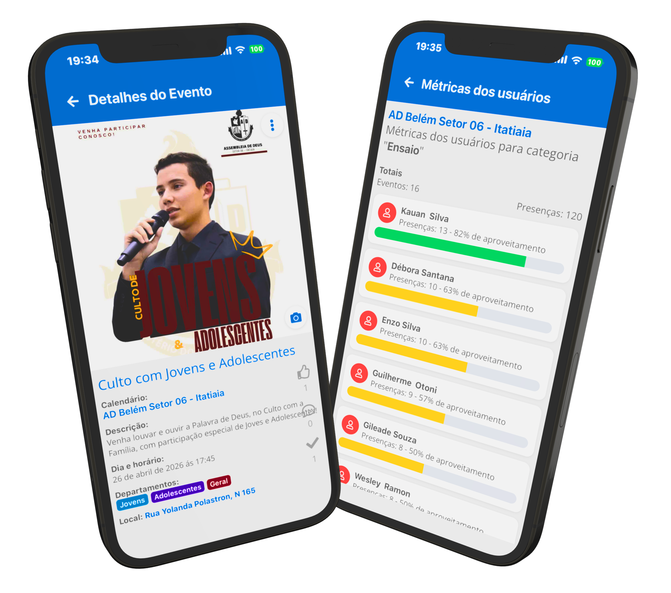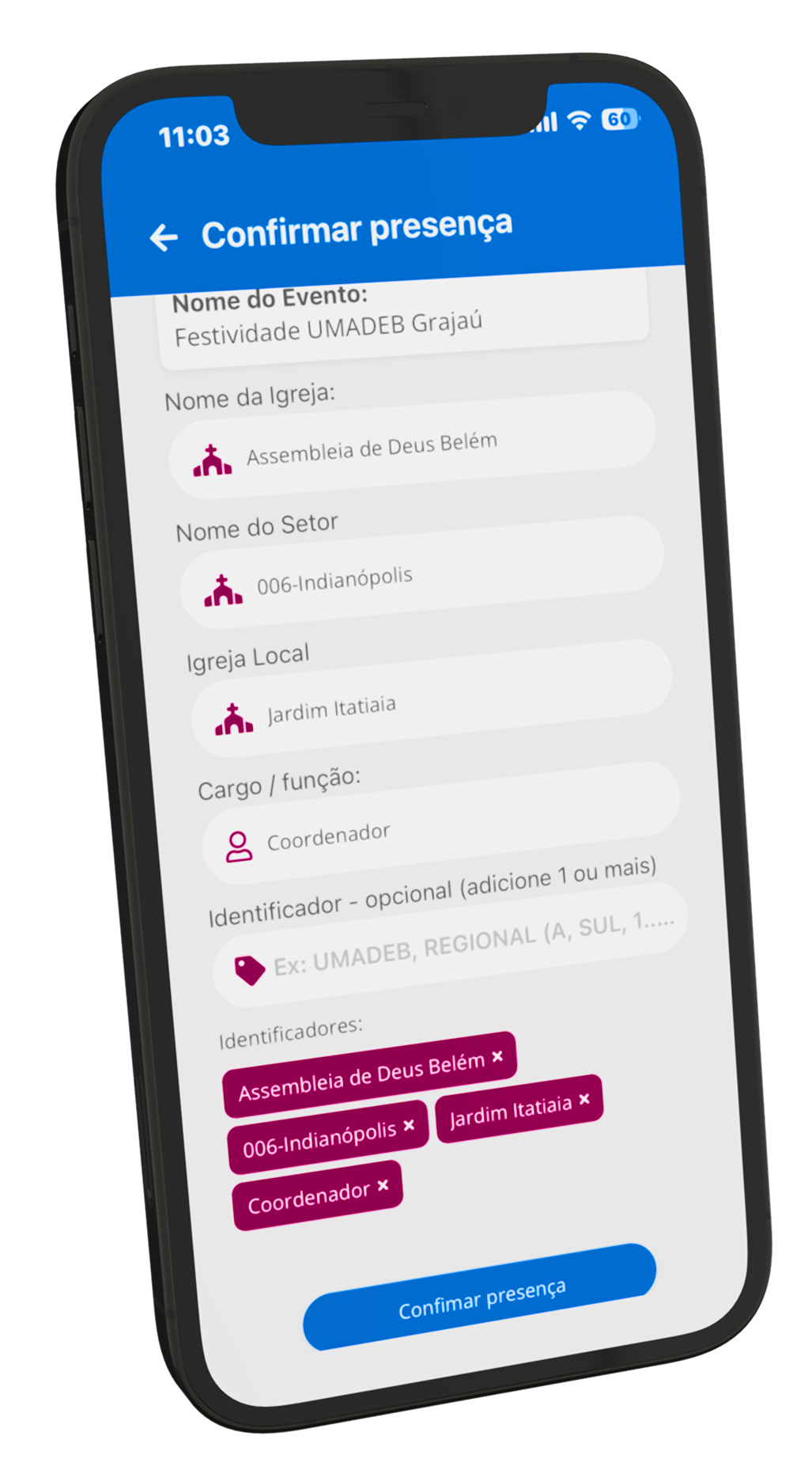 Use em cultos, reuniões, jovens e eventos para ter controle total de quem participou.