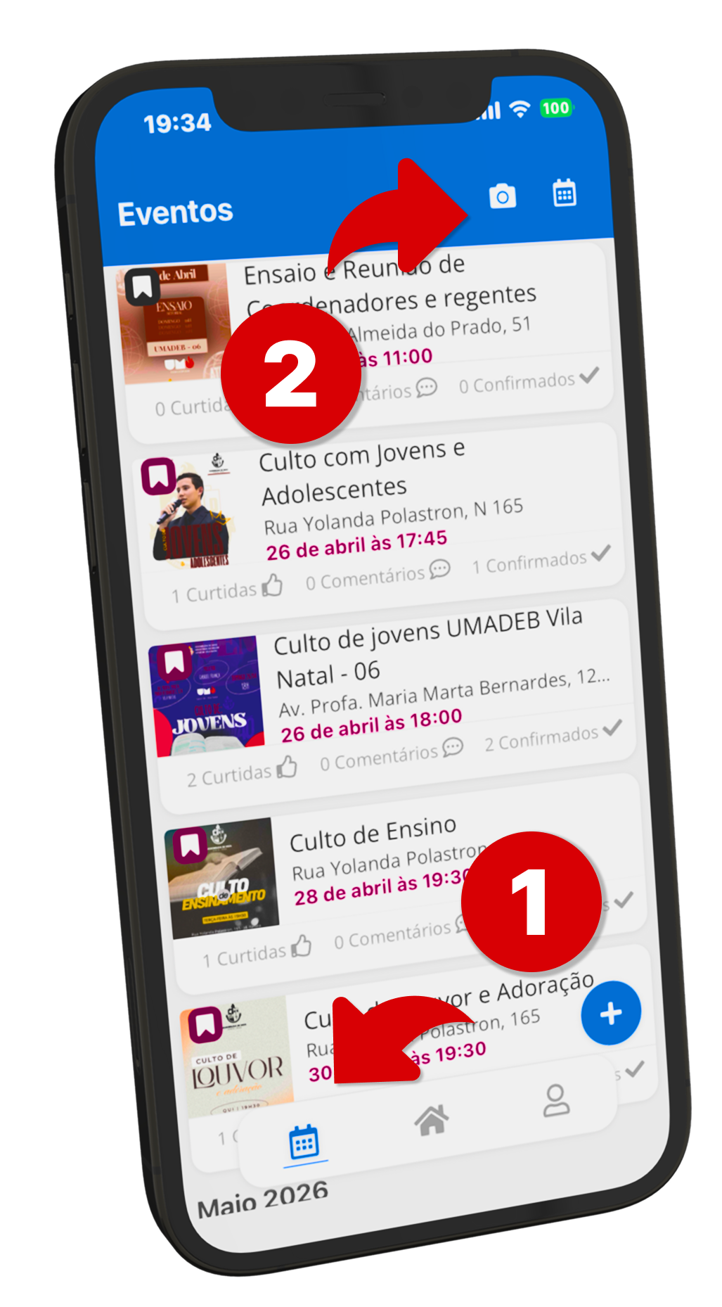 ✅ Após baixar e criar sua conta no app, vá até a guia eventos (1) e clique na câmera no topo da tela (2).